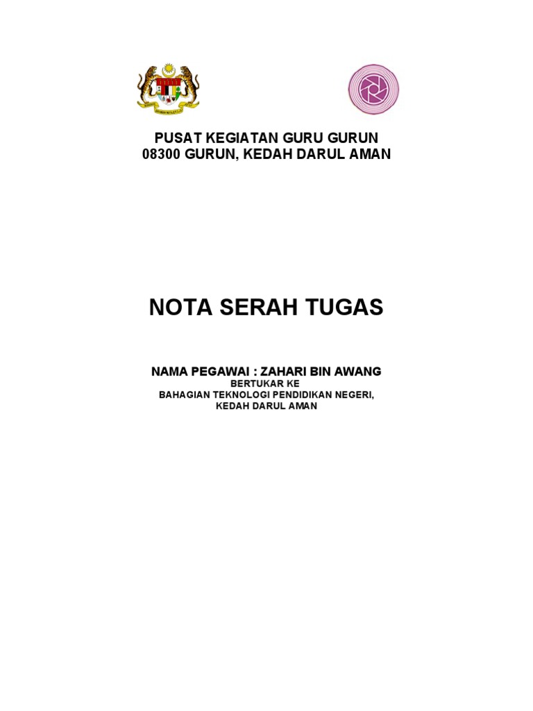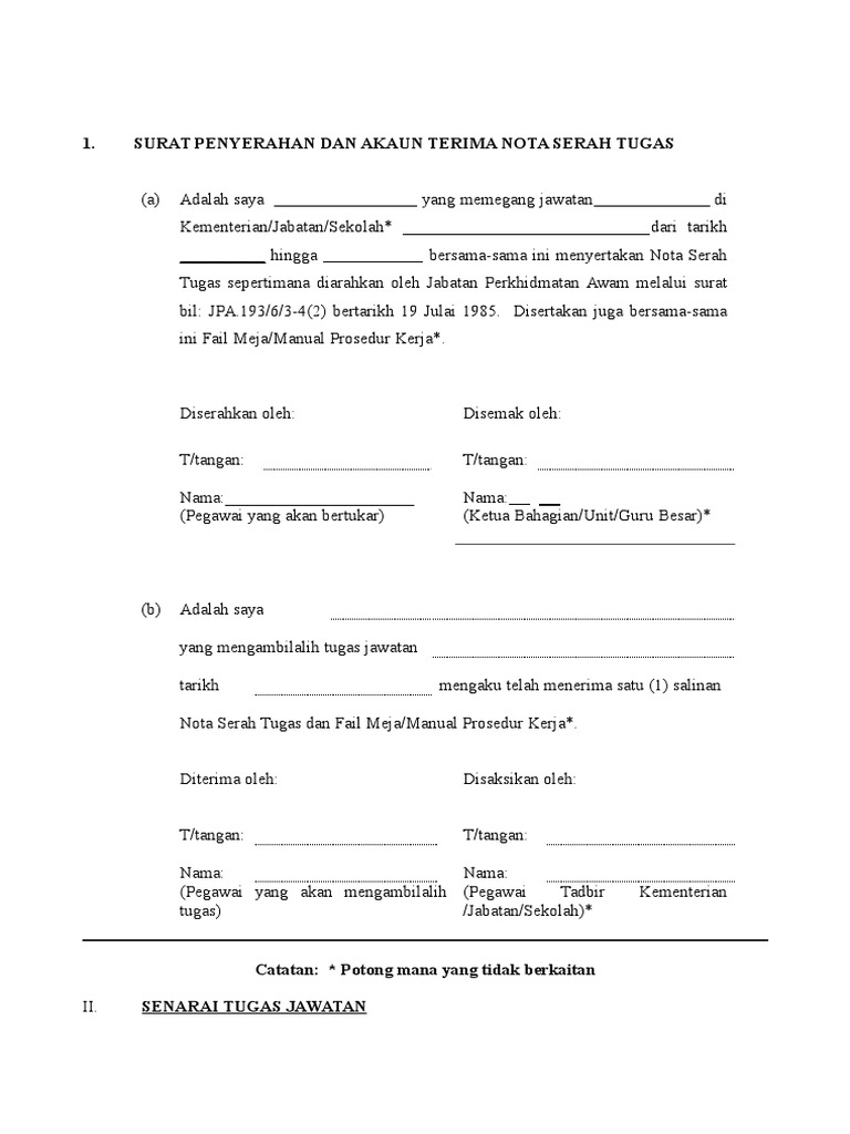 Borang serah tugas smk dabong. Merujuk kepada pekeliling perkhidmatan bil.3/2004 perkara 12 (viii) (b), ketua jabatan bertanggungjawab memastikan pegawai yang akan bertukar menyediakan nota serah tugas yang. 100%100% found this document useful, mark this document as useful. Tapi, kamu juga harus tahu beberapa organisasi dibawah pbb yang memiliki fungsi dan tugasnya masing masing. Lampiran 'a' nota serah tugas 2.